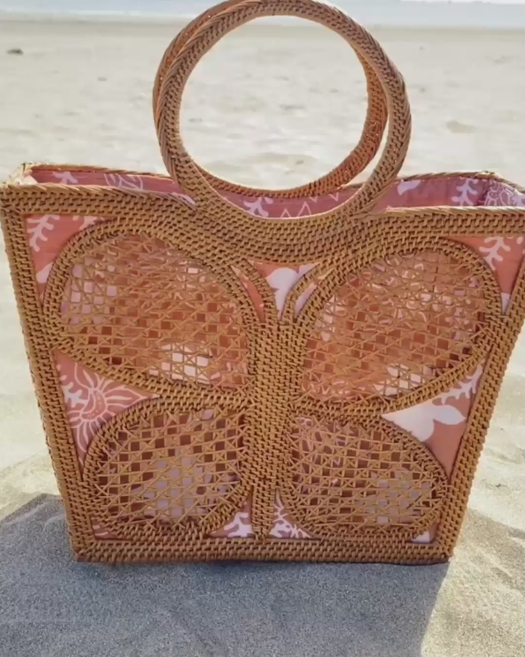 This butterfly rattan bag has been skillfully crafted using organic ata material. The material used to craft our bag is environmentally friendly and locally sourced to reduce carbon footprint. We work directly with local artisan partners within Indonesia. The lining used each of our bags are hand-picked to add a unique touch and pop of color to each bag.