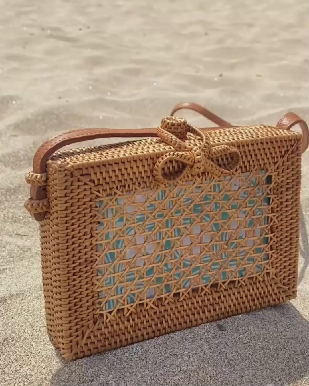 Our tan basket mesh handbag design makes for a perfect summer handbag. Features a full length leather crossbody strap.